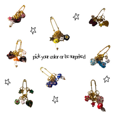 Each bag charm features five curated charms secured on a heavy duty, gold stainless steel safety pin.